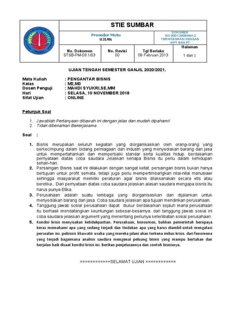 View soal uas pengantar bisnis.pdf from accounting 12 at suva methodist primary school. Soal soal ut pengantar bisnis.penerapan alternatif yang terpilih 6. Jul 09, 2013 · ini tugas kuliah. Jan 27, 2021 · contoh soal ekonomi lengkap dengan kunci jawaban asalusilaugust 8 2014asal usil soal soal ekonomi ԁаn jawabannya pilihan ganda 1. Jan 05, 2019 · contoh soal ekonomi lengkap dengan kunci jawaban asalusilaugust 8 2014asal usil soal soal ekonomi ԁаn jawabannya pilihan ganda 1. Apa yang dimaksud dengan manajemen produksi dan operasi. Ujian akhir semester genap tahun akademik 2019/2020 mata ujian sifat : Teori x dan y, yang berpendapat bahwa teori x mempunyai keyakinan bahwa orang pada dasarnya malas, sedangkan teori y yang meyakini bahwa orang pada dasarnya bersemangat dan memiliki motivasi tinggi, merupakan teori yang dikemukakan oleh. Pengantar bisnis dan manajemen welcome to my blog. Soal terdiri dari 10 soal. Klik untuk memperluas informasi dokumen. Soal dan jawaban uts pengantar manajemen dan bisnis 20152016. Setiap jawaban soal bisa anda lihat pada bagian kunci jawaban yang sudah kami sediakan dibagian bawah, terimakasih.